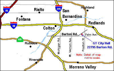 Directions to Grand Terrace City Hall The city of Grand Terrace, California is located just east of the 215 Freeway, between Colton and Riverside. Grand Terrace City Hall is located at 22795 Barton Road in Grand Terrace approximately a quarter mile East of Interstate 215. One of the easiest way to get to the City Hall is to get on Interstate 215 and take the Barton Road off-ramp. Go East (toward the rising sun) on Barton Road and about a block and a half past Mt. Vernon Street on the right (South) you'll see the large brick building which is City Hall. City Hall is located on Barton Road between the streets of Mt. Vernon (to the West) and Preston (to the East); both of which have traffic lights. Park where convenient (lots of parking available) and enter City Hall through the main entrance. Upon entering the building and looking to your right (next to the library), through glass doors, you'll see our meeting room. You can't miss us, we're the only thing going on at that time of the morning. We generally start the coffee and setting up the room at 6:45 AM and our meeting starts promptly at 7:00 (though feel free to enter even after we've started). You'll most likely be greeted at the door by our Sergeant-At-Arms, Mr. Tony Petta or by any other member who sees you looking around for the coffee and eats. |