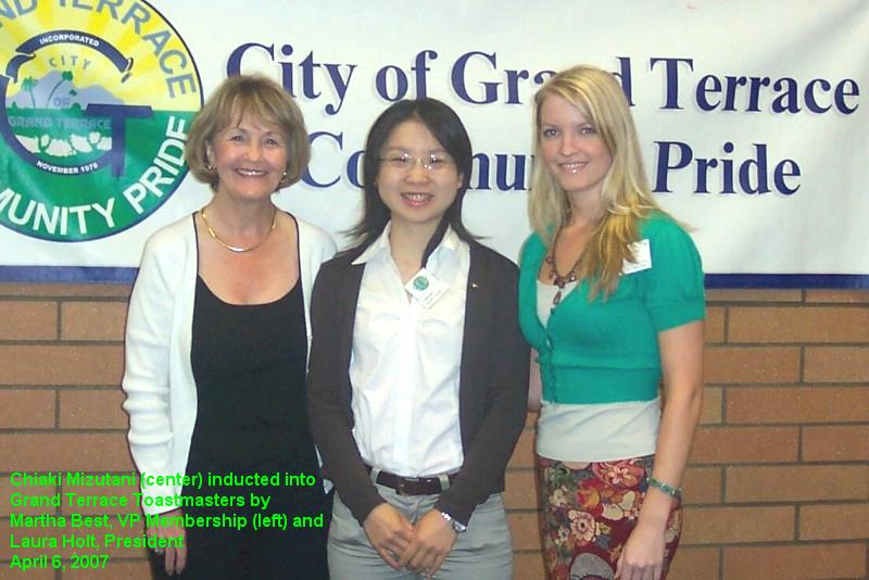Chiaki Mizutani was inducted into Grand Terrace Toastmasters on April 6, 2007 Steve Berry was inducted into Grand Terrace Toastmasters on March 2, 2007 Richard Pennington was inducted into Grand Terrace Toastmasters on March 2, 2007
