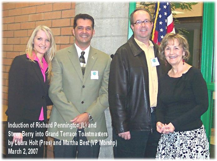 Chiaki Mizutani was inducted into Grand Terrace Toastmasters on April 6, 2007 Steve Berry was inducted into Grand Terrace Toastmasters on March 2, 2007 Richard Pennington was inducted into Grand Terrace Toastmasters on March 2, 2007